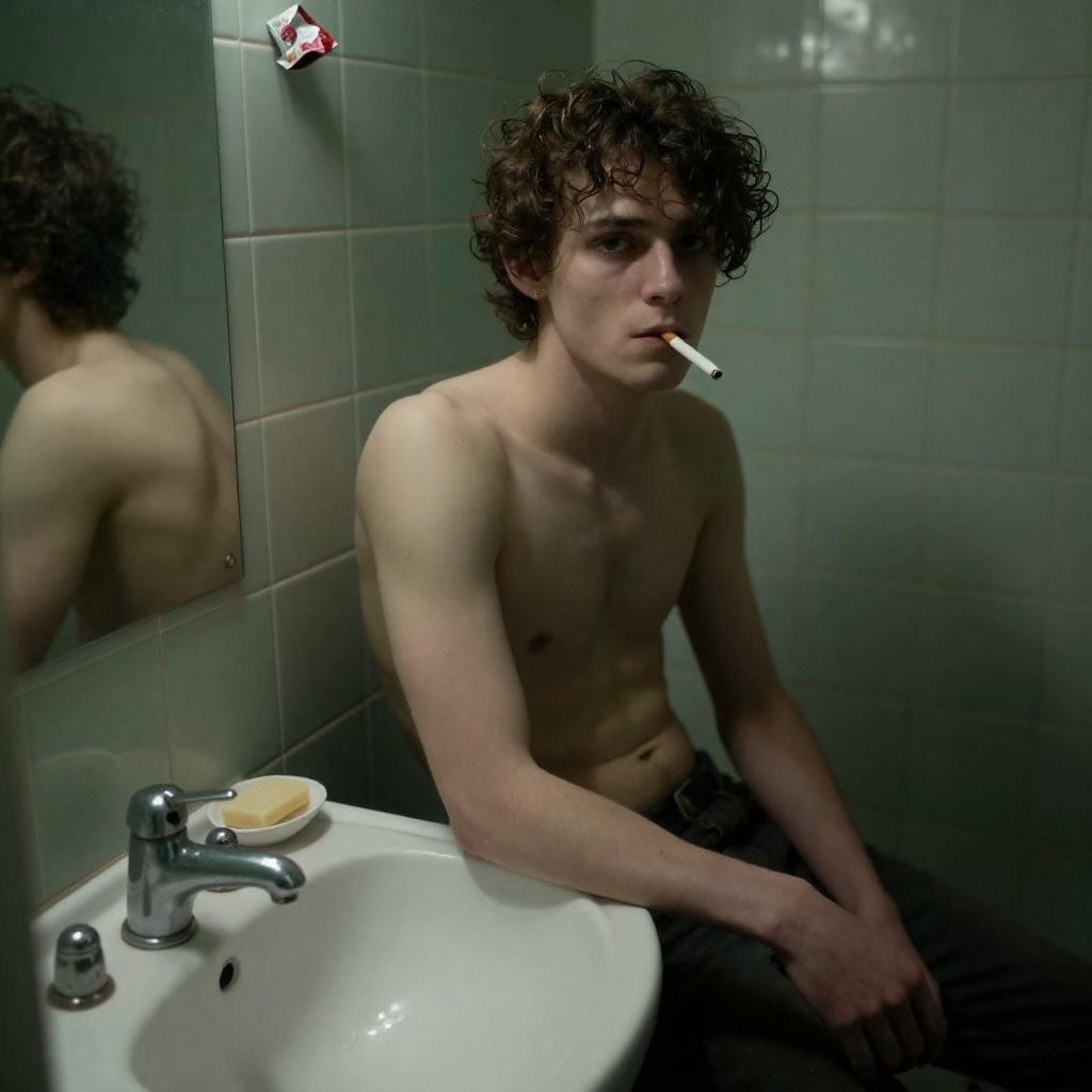 A photograph of a shirtless, blonde-haired man with fair skin lying on a gravelly floor, surrounded by broken glass. He wears a thin necklace and lies with his eyes closed, arms at his sides. The background features a dark, graffiti-covered brick wall. A tangled rope lies near his feet.