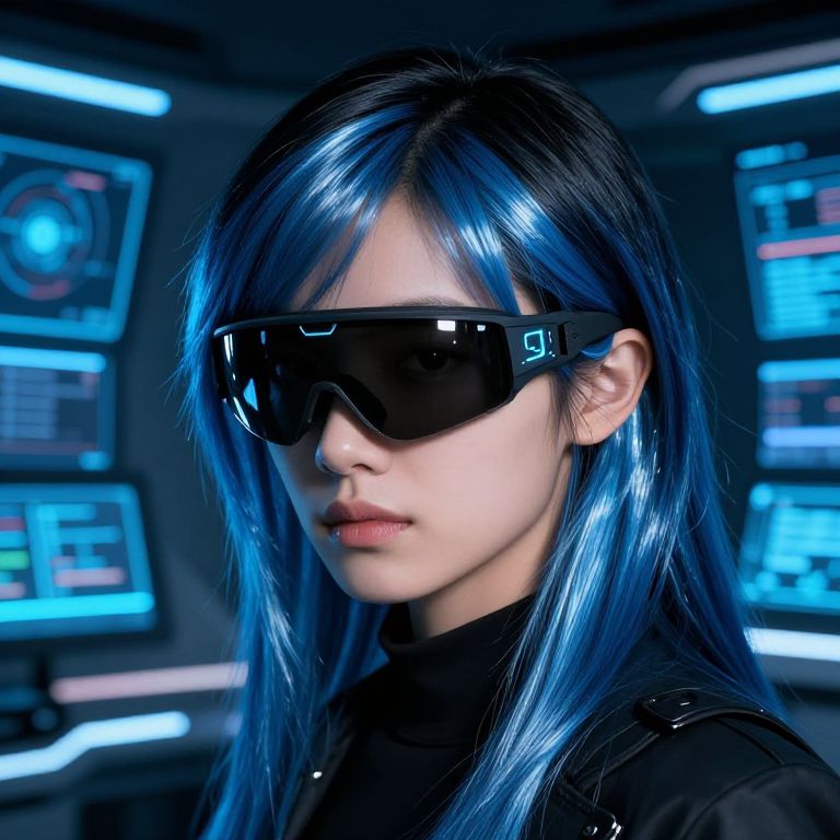 Spy hair with a futuristic twist, metallic blue highlights contrasting with dark roots, framed by advanced tech goggles, amidst a high-tech control room buzzing with holograms and digital interfaces, cyber-spy aesthetic.