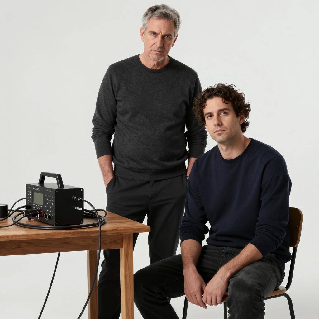Photograph of two men in medical robes. Older man with blonde hair, brown robe, standing, working on equipment. Younger man with dark hair, blue robe, sitting, connected to equipment. White background. Equipment on metal table. Cables connected to both men. Intense expressions on both faces.