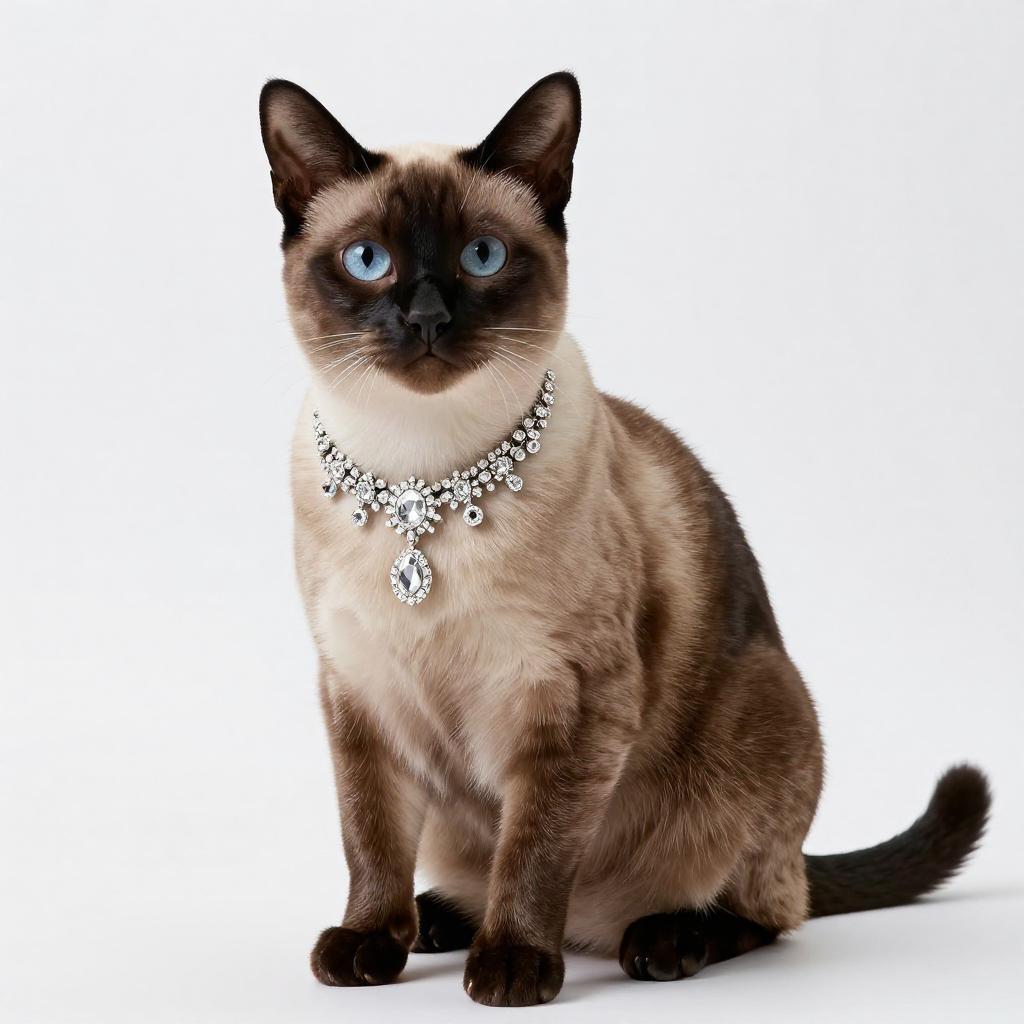 Luxurious studio portrait of a Siamese cat sitting upright, glossy dark fur, wearing an ornate sparkling diamond necklace, clean white background, high-end fashion pet photography, high resolution, ultra-detailed