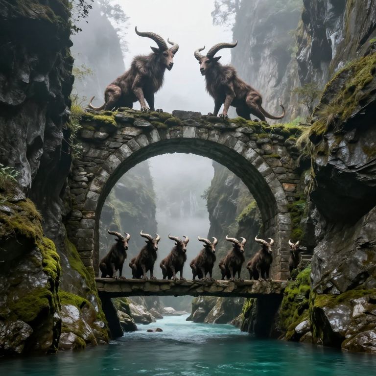 Photorealistic digital artwork depicting a group of twelve mythical goats with large, curved horns standing on a moss-covered stone arch bridge. The bridge spans a turquoise river flowing through a misty, rocky canyon. Two goats are perched on the top of the arch, while the rest stand on the lower part. The background features towering, moss-covered cliffs with sparse vegetation. The scene is illuminated by a bright, overcast light, creating a mystical, otherworldly atmosphere. The goats have dark, shaggy fur, adding to their mythical appearance.