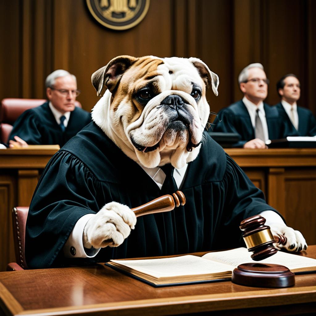 Pixar-style animated image of a serious bulldog dressed as a judge banging a gavel in a courtroom. The scene includes three human judges in the background and features detailed wooden decor, a judge's robe on the dog, and an open legal book on the desk.