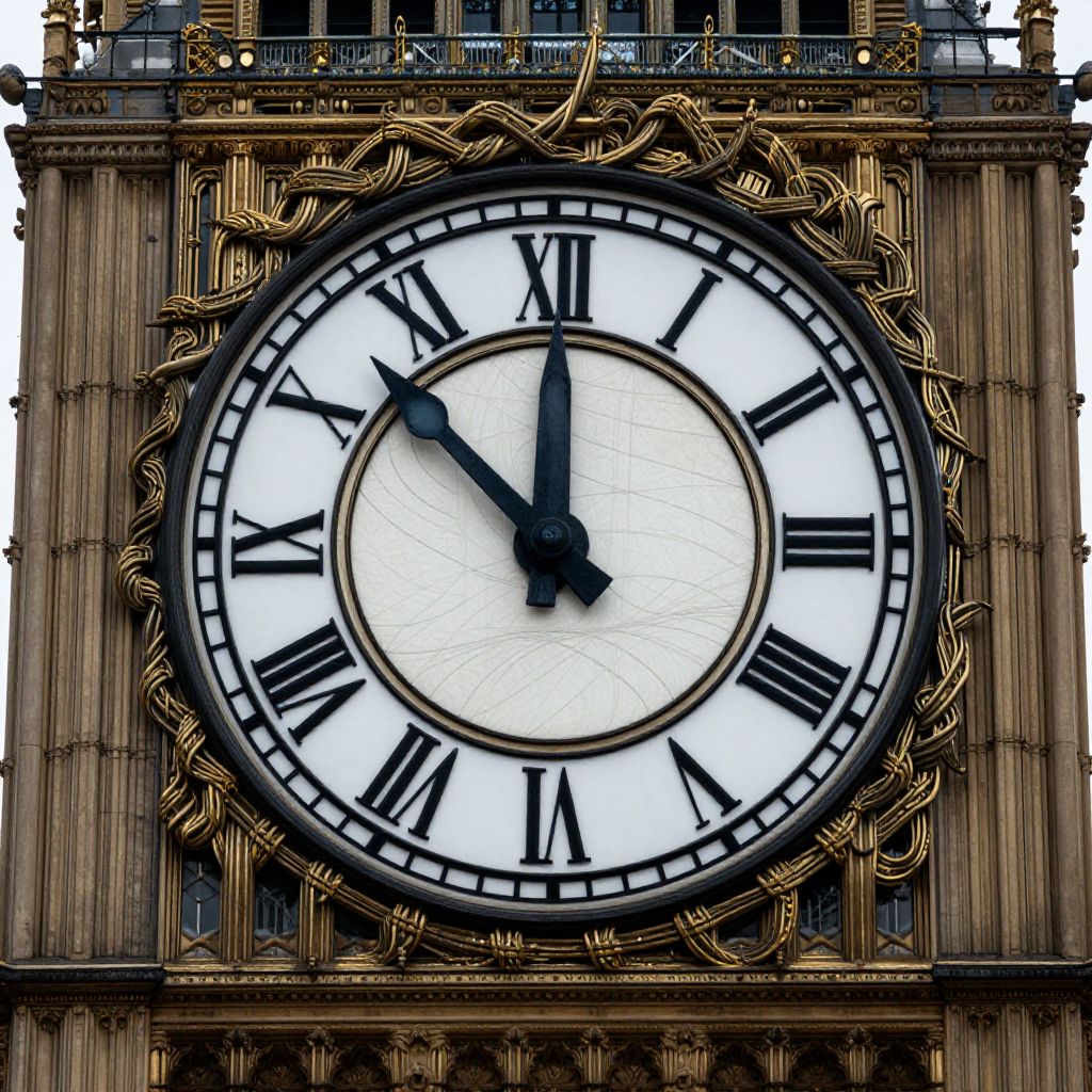 Time weaves a paradoxical dance around the clock tower, its hands entangled in a braid of past, present, and future, evoking a surreal tension between the relentless march of time and the human desire for control.