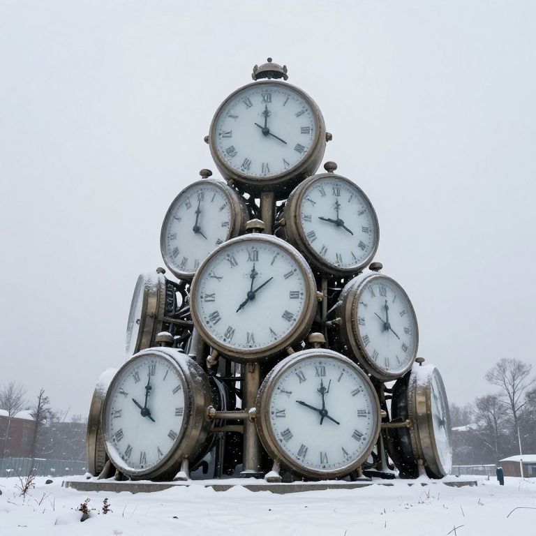 A towering, surreal monument of interlocking clocks and watches emerges from a snowy field, its frozen faces defying the passage of time and capturing eternity in a single, paradoxical structure.