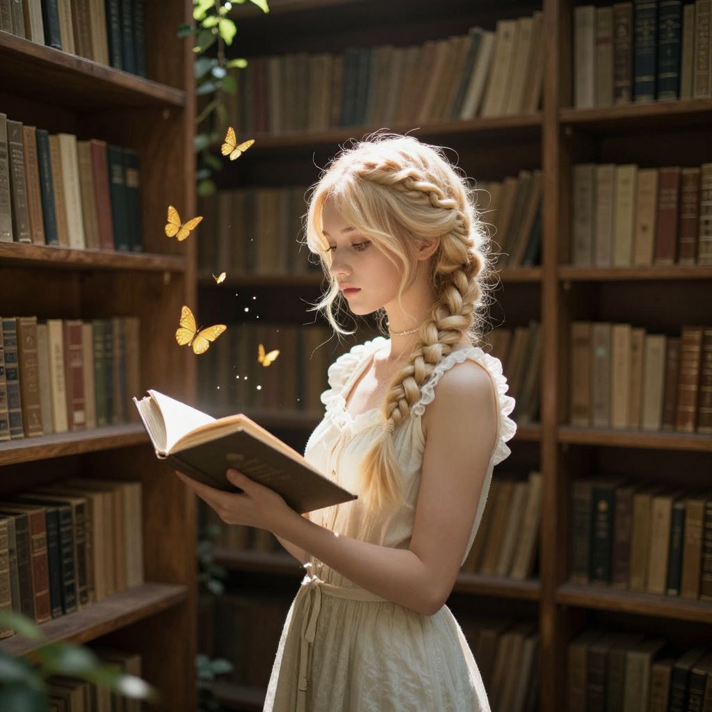 A young woman with ethereal blonde hair braided in intricate patterns stands amidst towering wooden shelves filled with books, her hands gently cradling an open tome as golden butterflies flutter around her, casting a magical glow in the dappled sunlight filtering through the forest-like library.