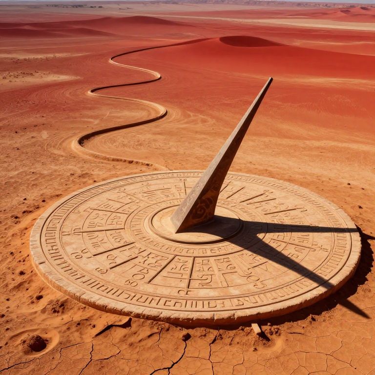 In the surrealistic style, envision an arresting scene set in a vast, arid desert landscape where an imposing, antique sundial commands attention. From a vantage point high above, observe the intricate, fantastical design of this sundial, its monumental gnomon casting elongated, serpentine shadows that weave into the sinuous patterns etched across the fissured earth below. The stark interplay between intense sunlight and rich hues of red and ochre creates an eerie ambiance, invoking a sense of both reverence and unease as one contemplates the immense span of time and space encapsulated within this enigmatic tableau.