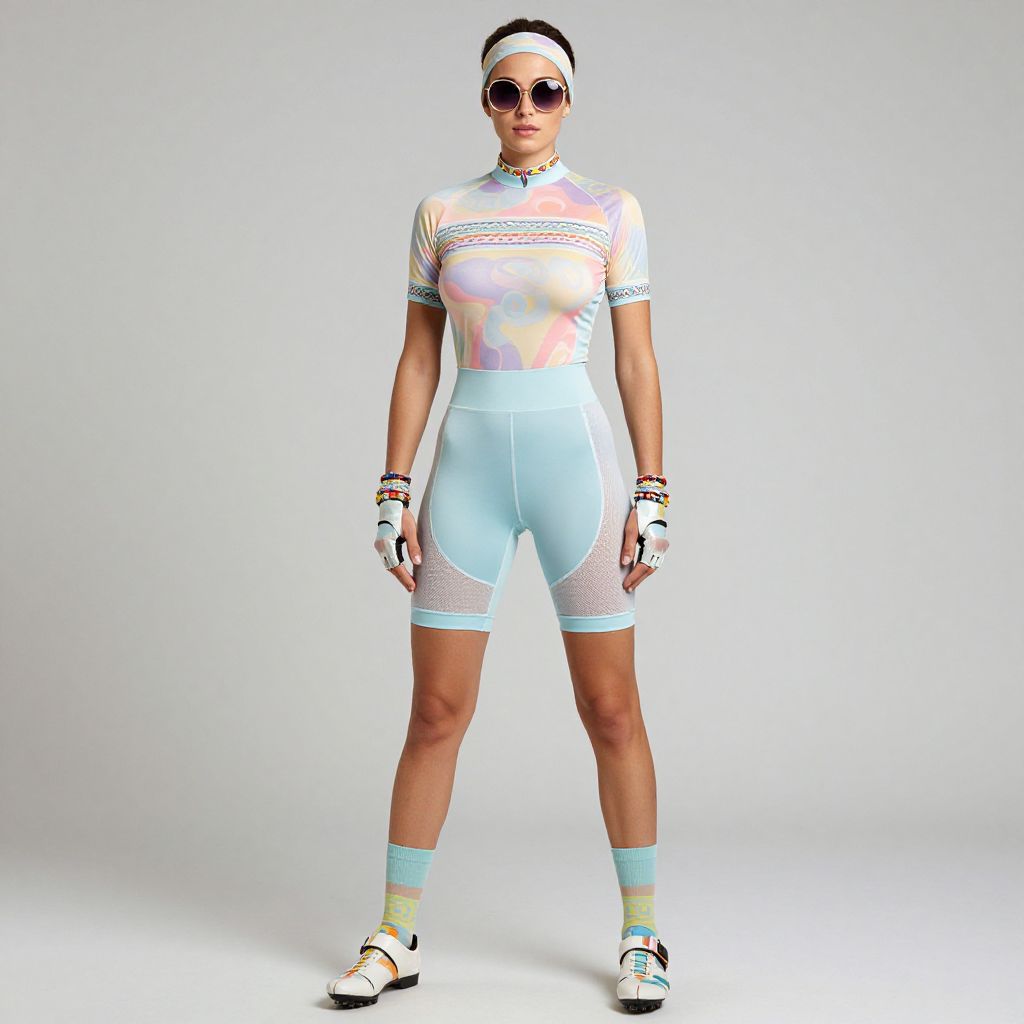 Photograph of a woman standing against a plain white background. She has a light brown skin tone and a slim, athletic build. She wears a semi-sheer, pastel-colored cycling jersey with geometric patterns, light blue high-waisted cycling shorts, and white sneakers with black accents. Her outfit is complemented by white socks with light blue and yellow stripes, and she has on round, dark sunglasses and a white headband. She accessorizes with several bracelets on her left wrist. The overall style is sporty and modern, with a focus on pastel colors and geometric patterns.