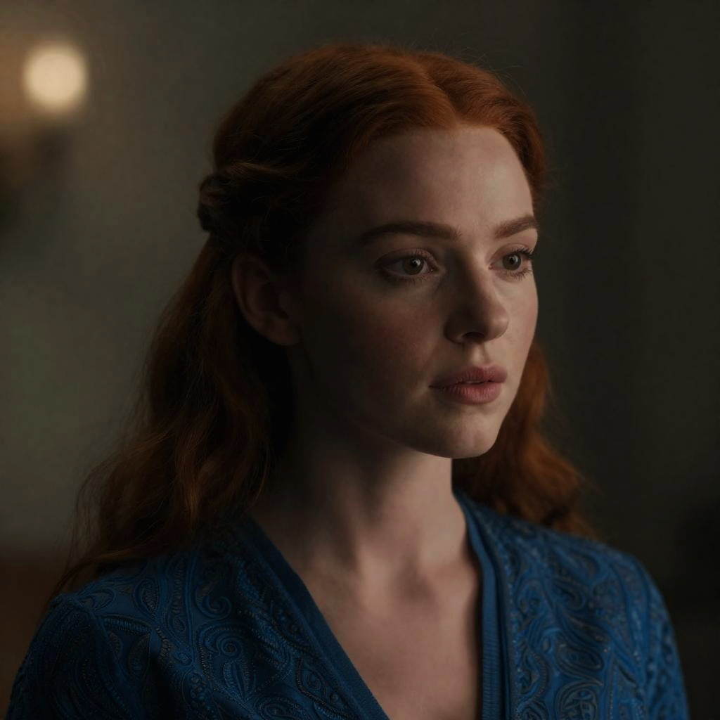 A breathtaking cinematic headshot of a red-haired woman wearing a blue filigree shirt. The image features shallow depth of field, vignette, and moody lighting, highlighting detailed skin texture and subtle blush. The photograph has a high budget Hollywood film quality with film grain and a bokeh background, creating an epic and professional masterpiece look.