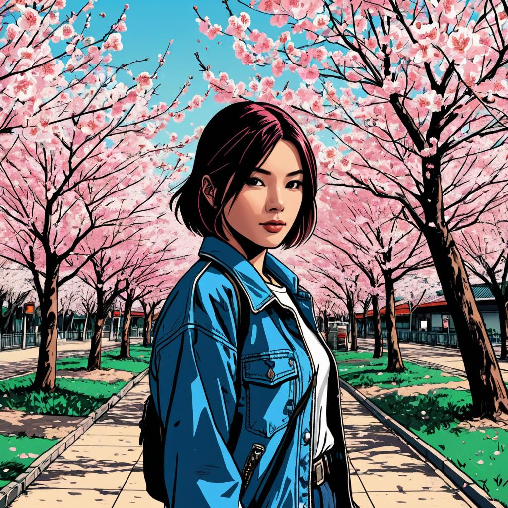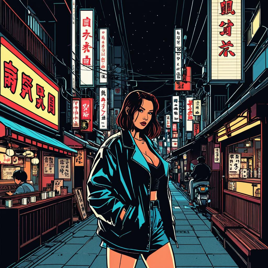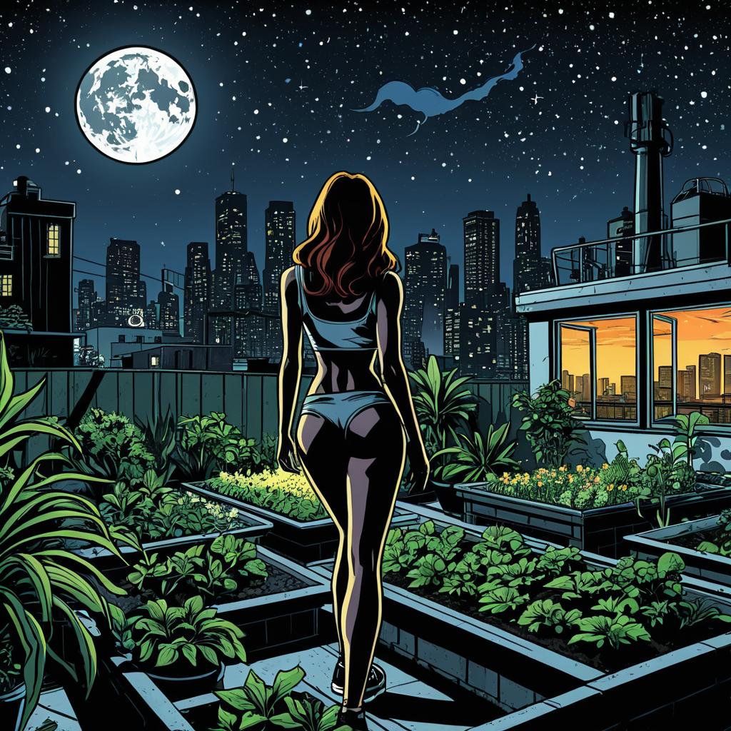Hot girl, urban rooftop garden in twilight, in the style of a vintage pulp magazine, loading screens, gta style artwork, highly detailed, celshading, digital painting style, dramatic composition, 21st century comic book cover, studio lighting, bold contour lines drawing