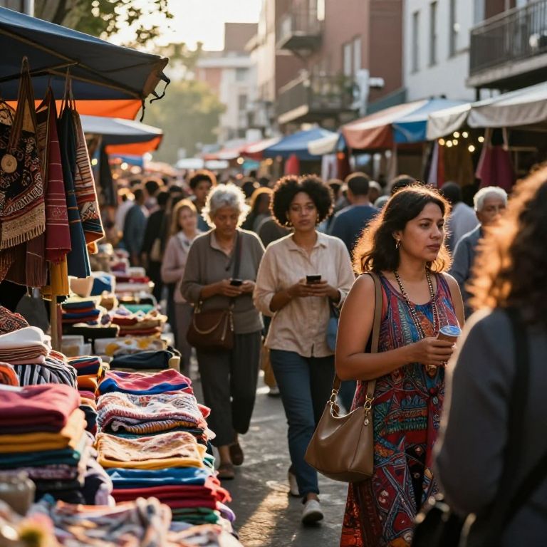 Photograph of a bustling outdoor market street at sunset, with diverse shoppers browsing colorful textiles, vibrant patterns, and stalls under blue and orange canopies.