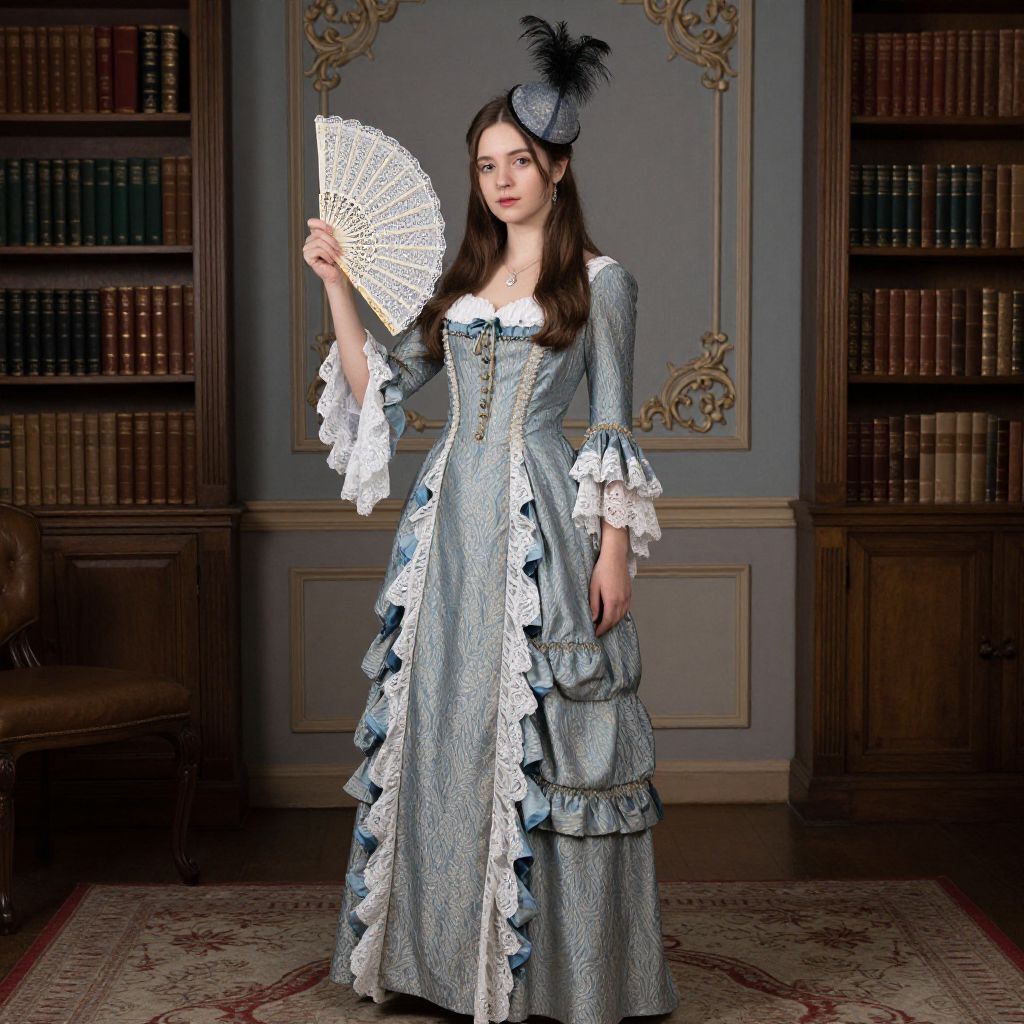 A realistic full body portrait of a young woman with long brown hair wearing an elegant, long blue jacquard gown with lace details and ruffled sleeves, accessorized with a feathered hat and holding an antique lace fan. The setting features a refined, moonlit Regency Era library ambiance with decorative framing.