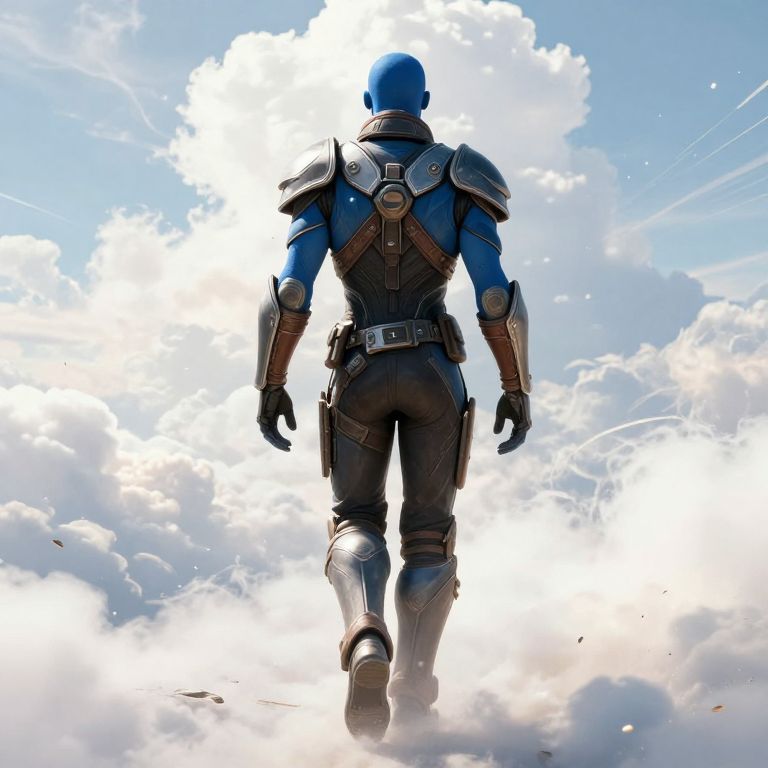 Creature Design lance reddick as commander zavala from destiny 2 with blue skin in a full body frame walking away towards heaven, ultra realistic,