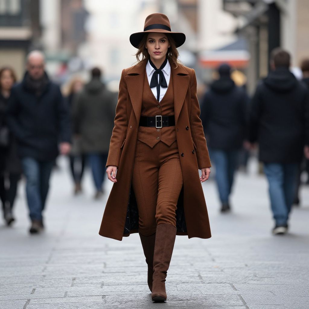 Photograph of a confident woman walking down a city street in a brown, vintage-style, three-piece suit with a long, brown overcoat and black tie. She has dark brown hair, wearing a brown fedora hat. The suit includes a brown waistcoat and trousers, with a black belt. She is also wearing brown boots. The background features blurred pedestrians in dark winter clothing, and the street is paved with gray tiles. The overall style is reminiscent of a 1940s detective, with a modern urban twist. The lighting is natural, with overcast skies.