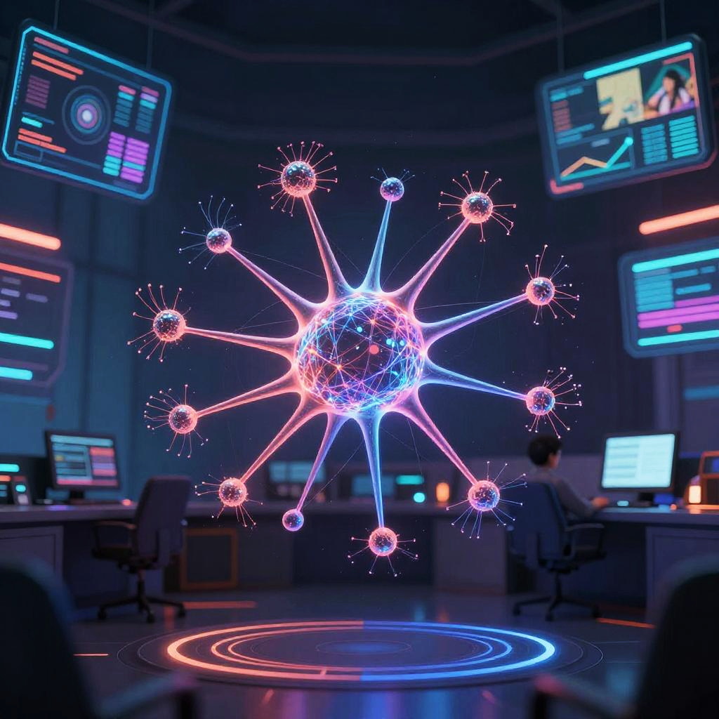 Stable video AI technology visualized as a futuristic neural network streaming seamless, glitch-free video sequences in a high-tech control room with holographic interfaces, vibrant colors.