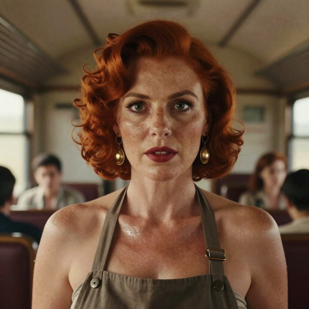 This photograph features a close-up of a fair-skinned woman with vibrant red, wavy hair styled in loose curls. She has striking green eyes, dark red lipstick, and is wearing gold, dangling earrings. She is dressed in a brown, sleeveless apron that ties at the neck, revealing her freckled shoulders. The background is slightly blurred, showing a dimly lit bus with other seated passengers, including a man with dark hair and a woman with red hair, both in dark clothing. The image has a slightly vintage, cinematic style with a soft focus effect. The woman's expression is serious and intense, drawing attention to her face.