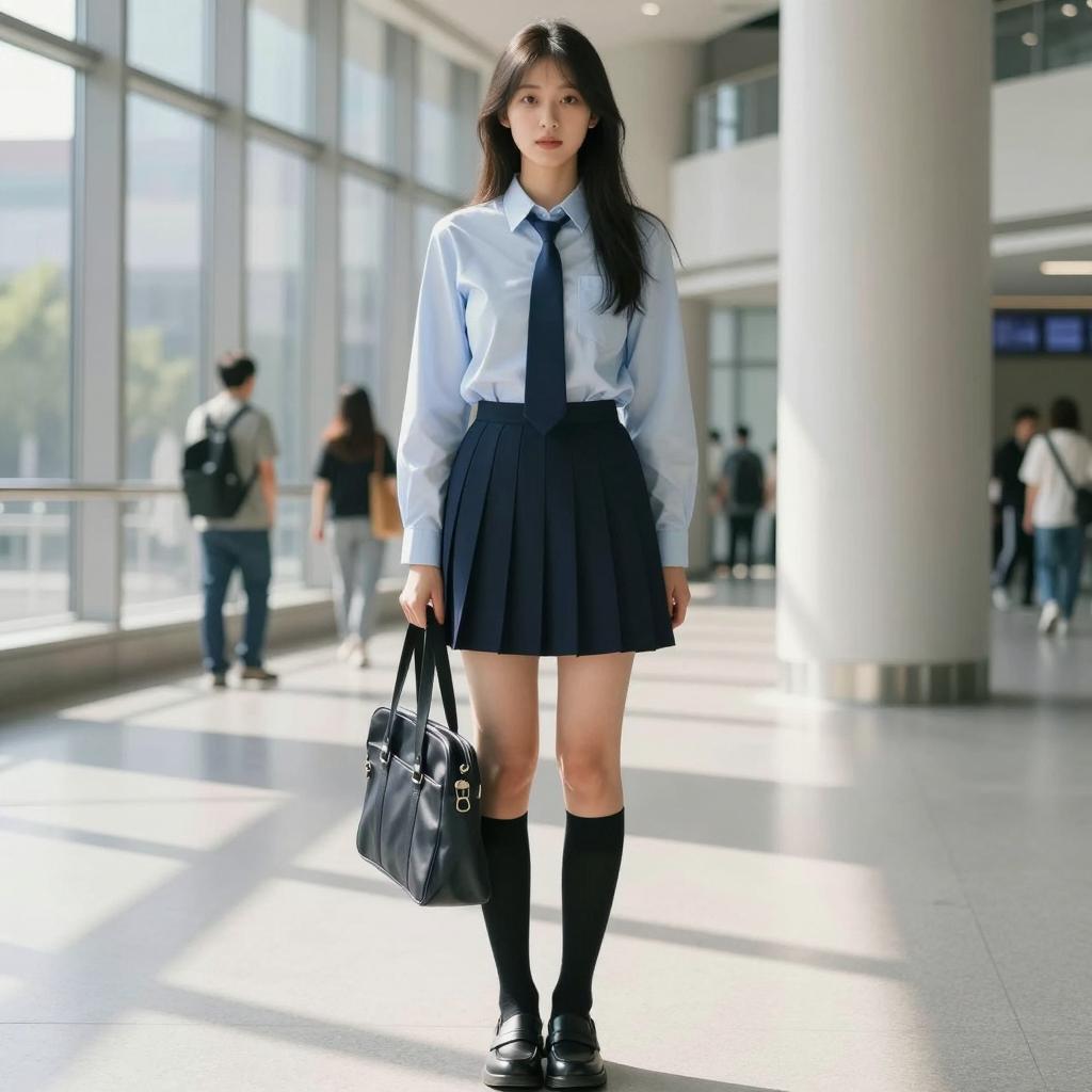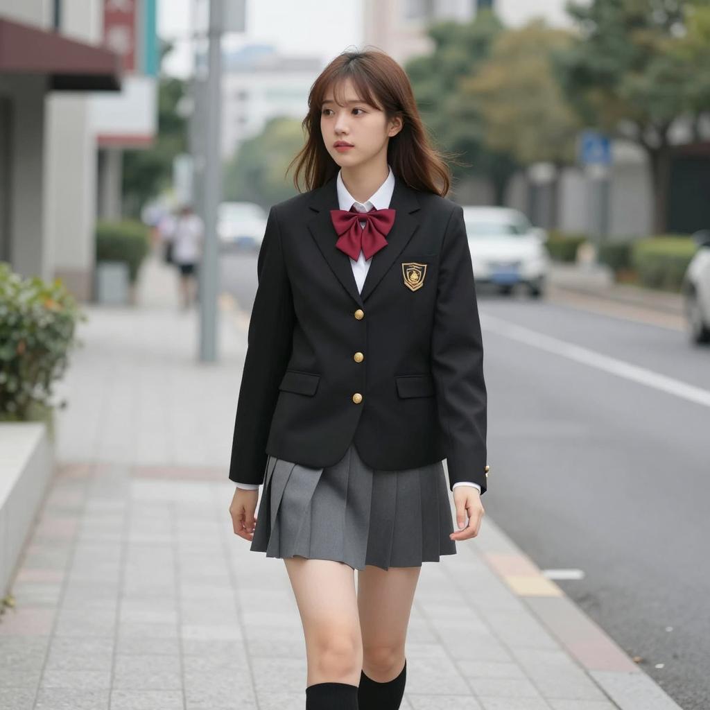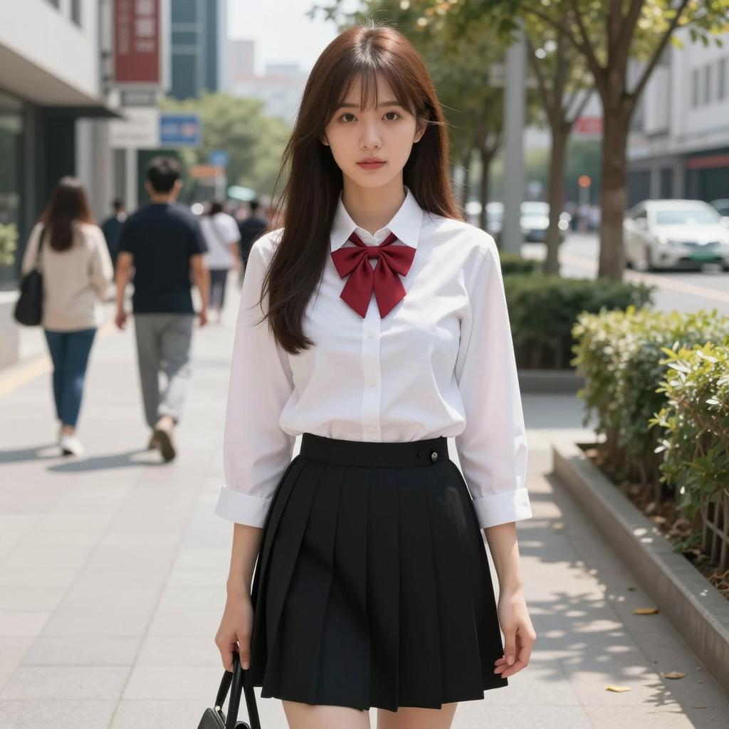 Asian teenage girl with long brown hair in pigtails, white blouse with red bow, blue plaid skirt, black knee-high socks, black loafers. Standing on urban street, blurred pedestrians in background, bright lights. Blurred cityscape in background. She looks slightly down, neutral expression.