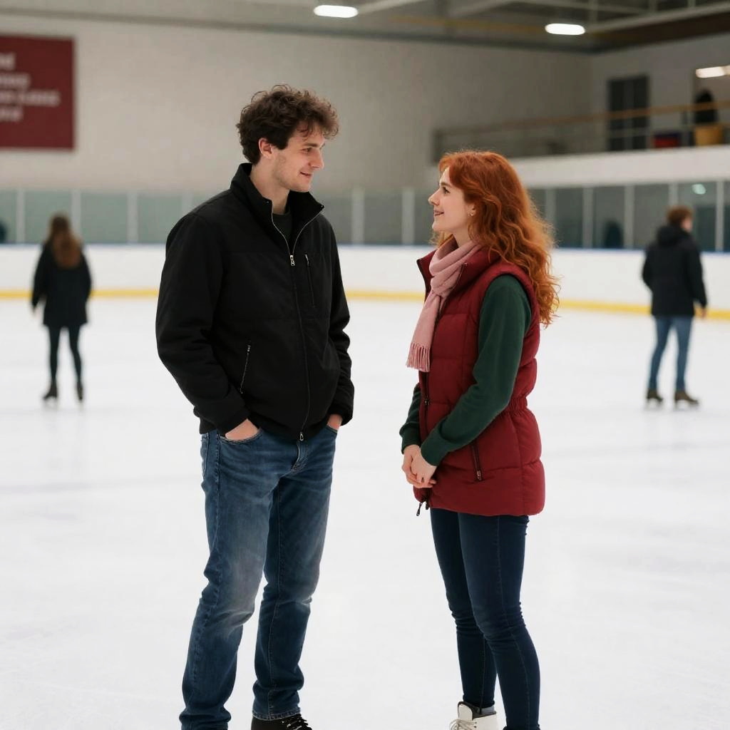 Photograph of a man and woman ice skating indoors. Man with dark hair, black jacket, blue jeans, hands in pockets. Woman with red hair, green long-sleeve shirt, red puffy vest, pink scarf, hands clasped. Both facing each other, smiling. Background: indoor ice rink, other skaters, banners on walls.