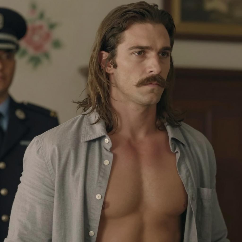 Close-up photograph of a serious-looking man with curly brown hair, blue eyes, and a slight mustache. He wears a dark, leather-like garment with a blue collar. Background is dark and blurred. Intense expression.