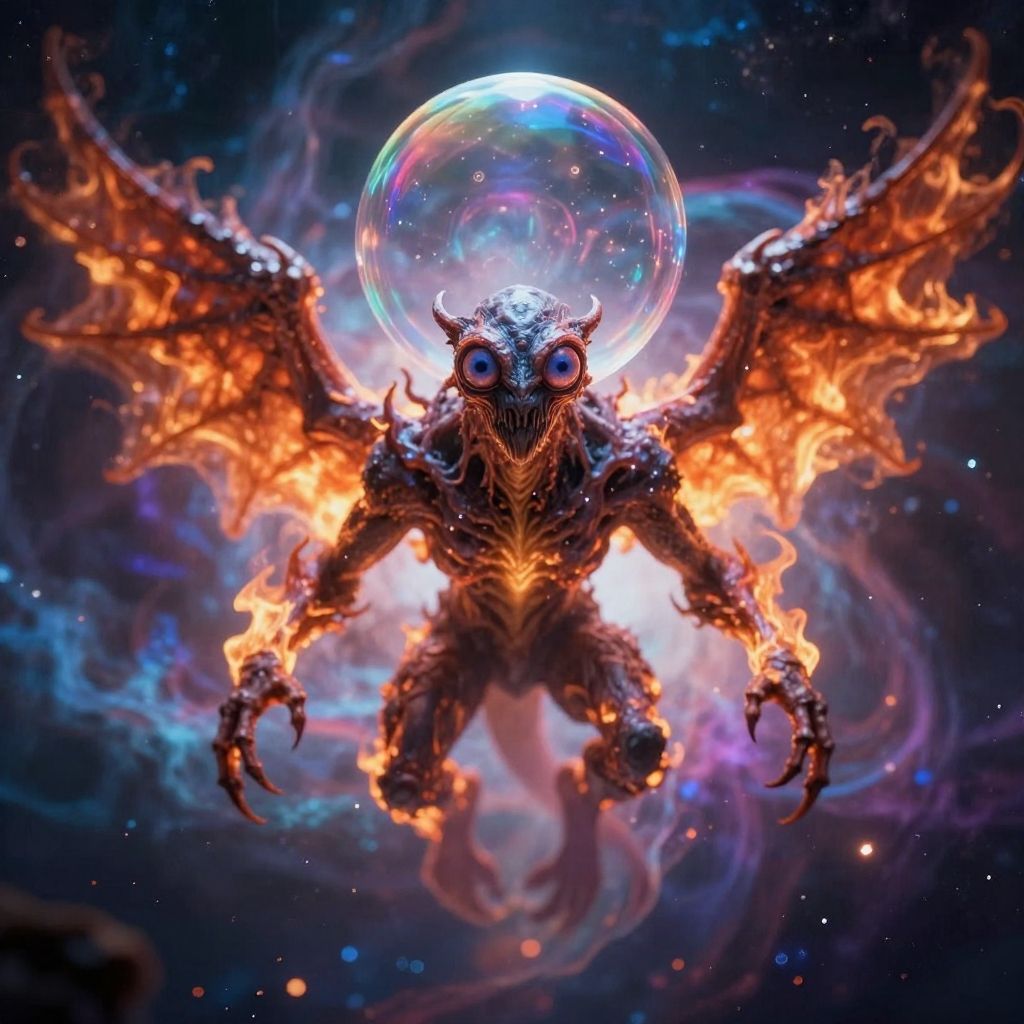 Quantum, masterpiece, high quality, realistic, no humans, blurry, monster, extra eyes, bubble, alien, wings, fire, nebula, transdimensional, kaleidoscopic