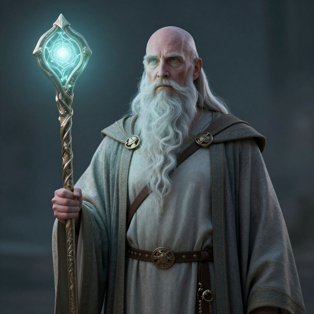 Photograph of a bald, elderly wizard with a long, white, flowing beard and piercing blue eyes. He wears a grey, hooded robe with intricate gold brooches and a brown belt. The wizard holds an ornate, glowing staff with a blue, crystalline orb at the top, emitting a bright, ethereal light. The background is a dark, misty blue, adding a mystical ambiance. His expression is serious and wise, and his attire and staff suggest a magical or sorcerous nature. The image has a fantasy, CGI-like quality, emphasizing magical realism.
