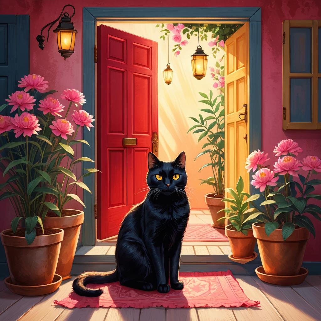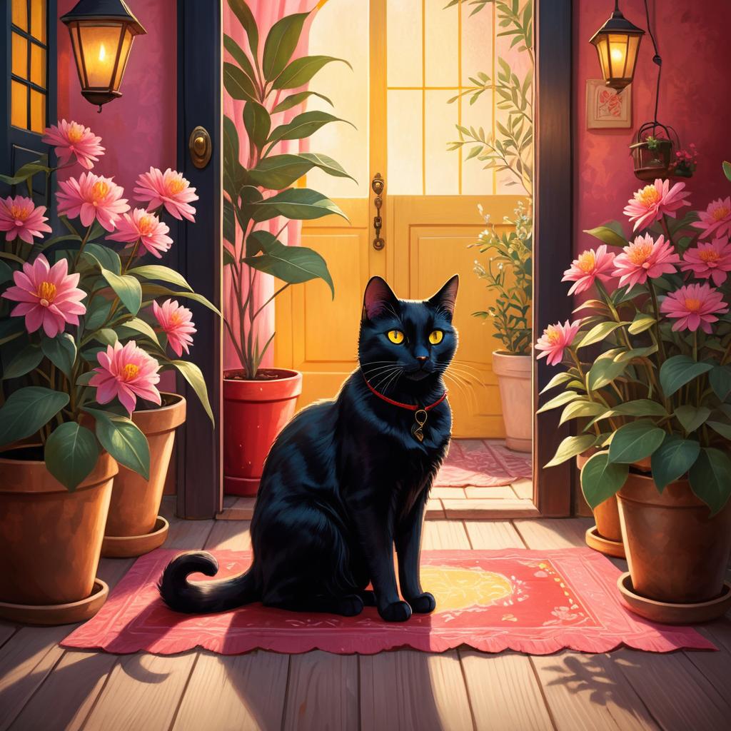 A black cat with yellow eyes sitting on a red cloth near a door with warm glowing light behind, surrounded by potted plants with pink flowers and vintage lanterns in a cozy room, detailed realistic style with warm cozy lighting and soft shadows, painterly texture enhanced, atmospheric warm glow