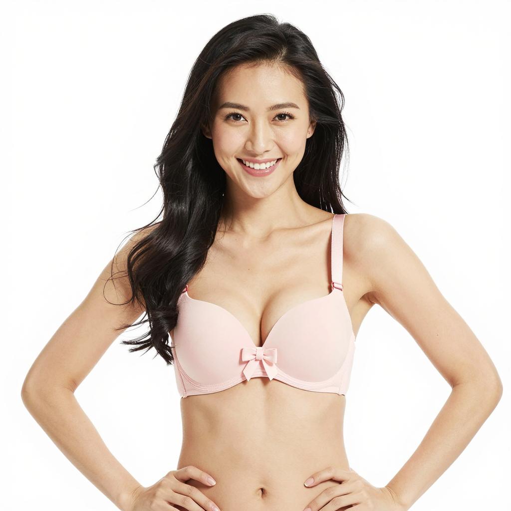 Portrait of a young Asian woman with long black hair, smiling confidently with her hands on hips. She is wearing a light pink strapless bra featuring a bow detail in the center. The image has a clean white background.
