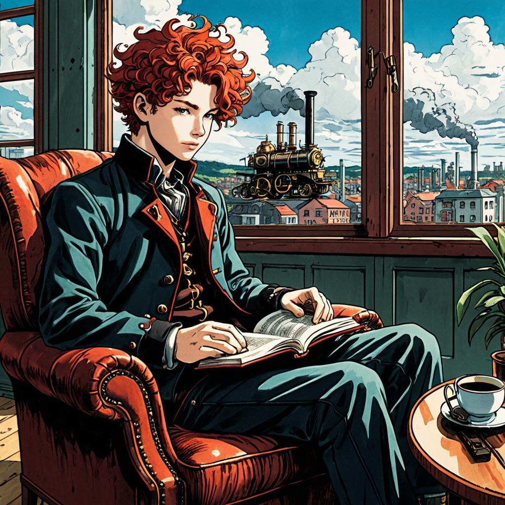 Illustration of a 17-year-old Caucasian boy with curly red hair, seated in a vintage armchair, reading a book. The scene includes a steampunk gadget on the coffee table beside a cup of coffee. Background window views show a cloudy sky and an industrial town with factory smokestacks. Rendered in bright, sketch-style shōnen manga art.