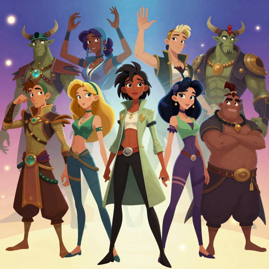 Characters to draw generator featuring an imaginative blend of fantasy and sci-fi beings, with diverse body types, expressive faces, and intricate costumes, set against a vibrant digital art background with glowing elements and dynamic poses.