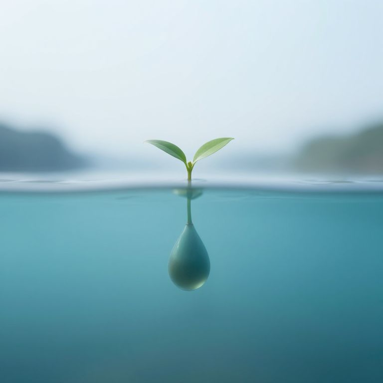 Suspended between sky and sea, a delicate sprout emerges from a teardrop, symbolizing resilience and hope amidst the tempestuous embrace of nature, where serenity meets chaos in a profound dance of life and renewal.