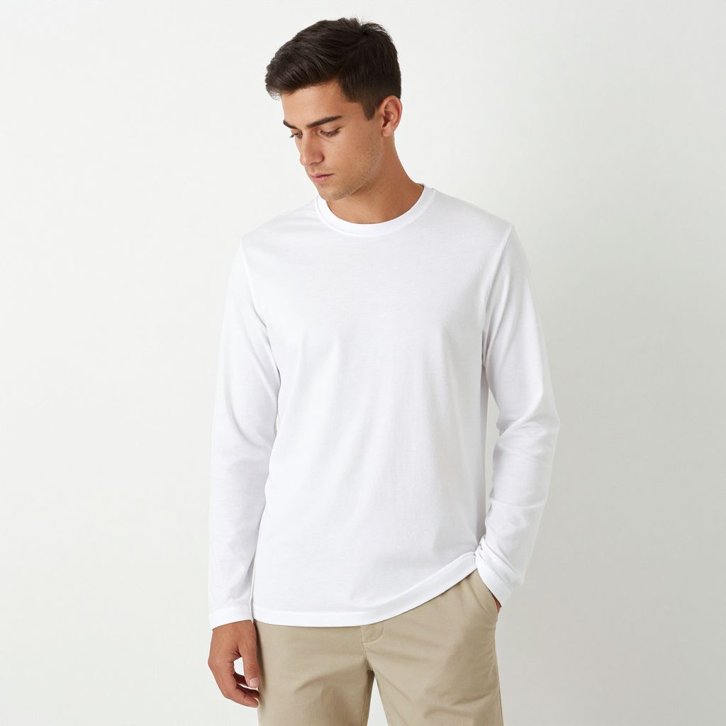 Photograph of a young man with short, dark hair, standing against a plain white wall. He's wearing a white, long-sleeve, crew-neck shirt and beige pants. His right hand is in his pocket while his left arm hangs relaxed at his side. He has a slightly serious expression and is looking downward. The lighting is bright, making the white shirt stand out prominently.