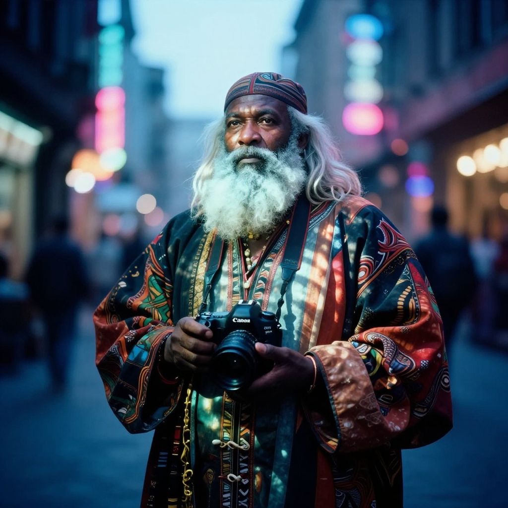 Cinematic film still ethereal fantasy concept art of photograph, Neon Light, Kodak Tri-X 400, Light and shadow plays, Canon eos 5d mark 4, HDR, in Supersized Burundian Urban clothing, Friendly stout Norse Uncle, side lit, Zen, Cold Lighting, Ilford FP4 125, This is a captivating photograph showcasing a friendly stout Norse uncle in supersized Burundian urban clothing under cold light illumination. The image features a vibrant neon light creating intriguing light and shadow plays across the scene. Shot using Kodak Tri-X 400 film, the photo is captured on a Canon EOS 5D Mark 4 camera with HDR technique applied. The assistant holding an Ilford FP4 125 camera contributes to the overall composition of this stunning portrait. This image truly encapsulates the essence of street photography in . magnificent, celestial, ethereal, painterly, epic, majestic, magical, fantasy art, cover art, dreamy . shallow depth of field, vignette, highly detailed, high budget, bokeh, cinemascope, moody, gorgeous, film grain, grainy
