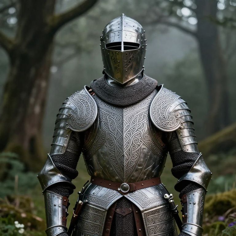 Irish medieval armor shining under sunlight, intricate Celtic knotwork engraved, worn by a fierce warrior standing in a misty green forest, realistic style, high detail, dramatic lighting