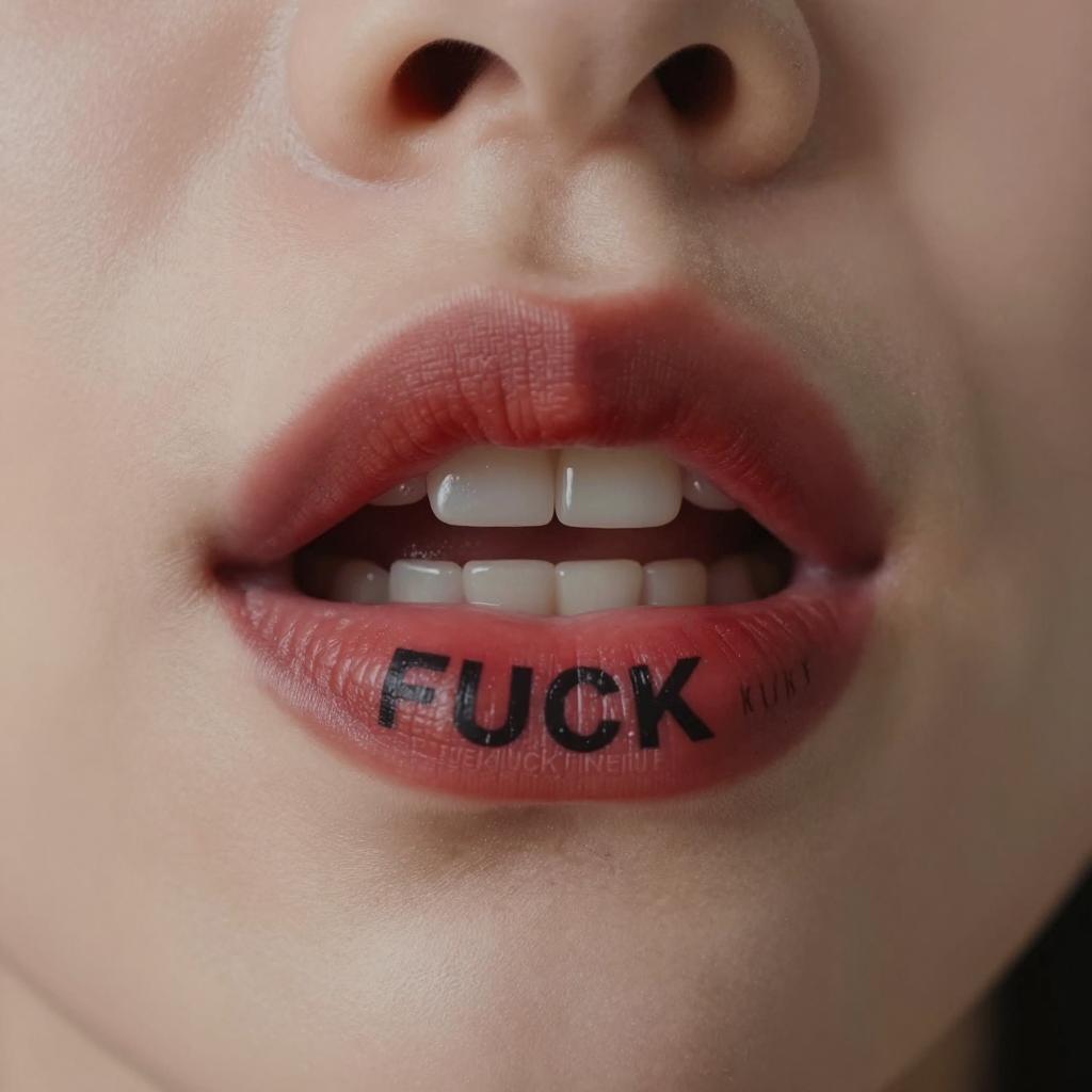 Close-up photograph of a woman's slightly parted lips with across them in black letters. Her lips are painted dark red and have a subtle sheen. The repeats the word "FUCK" repeatedly. Her skin is light. The focus is on her lips, with the background blurred.