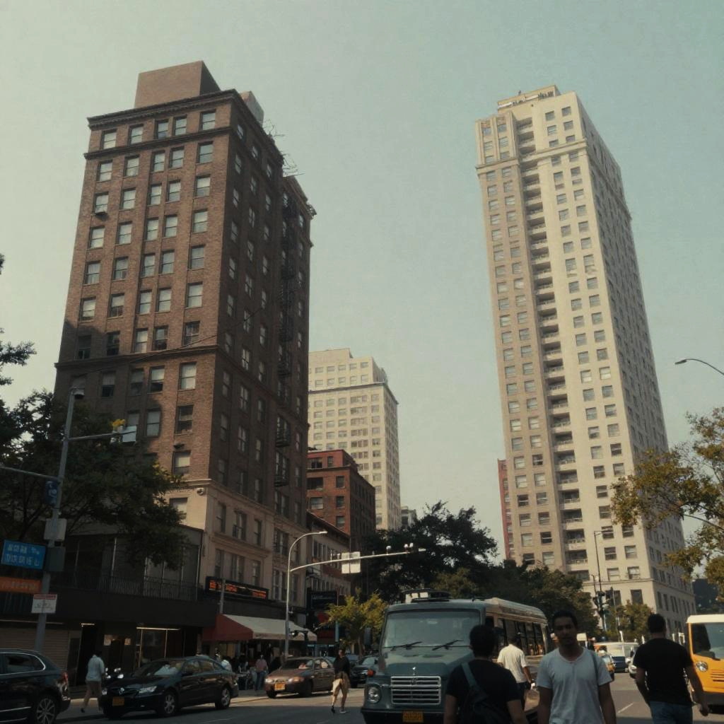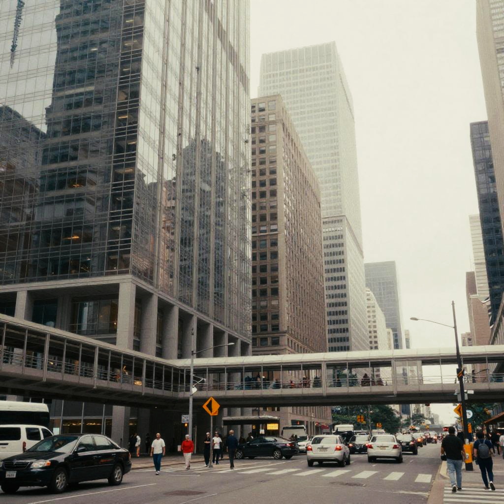 Collage inspired by Postmodernism, featuring flat double exposure of crowded urban spaces, mirrored skyscrapers and colorful signage, evoking a nostalgic city ambiance with muted hues