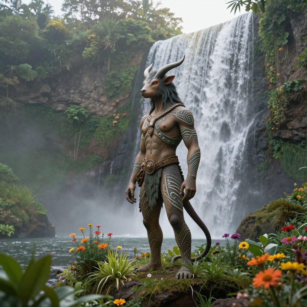 Lutus in a mythical landscape, half-human half-animal form with intricate tribal markings, standing beside a cascading waterfall, lush greenery and vibrant flowers all around, soft morning light creating a calm and enchanting mood.
