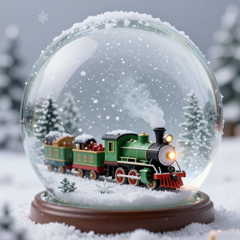 Glistening snowflakes cascade within a transparent snow globe as a miniature green steam locomotive, illuminated by warm headlights, leads a festive train through a wintry landscape, its wheels spinning in synchronized harmony with the serene, twinkling backdrop.