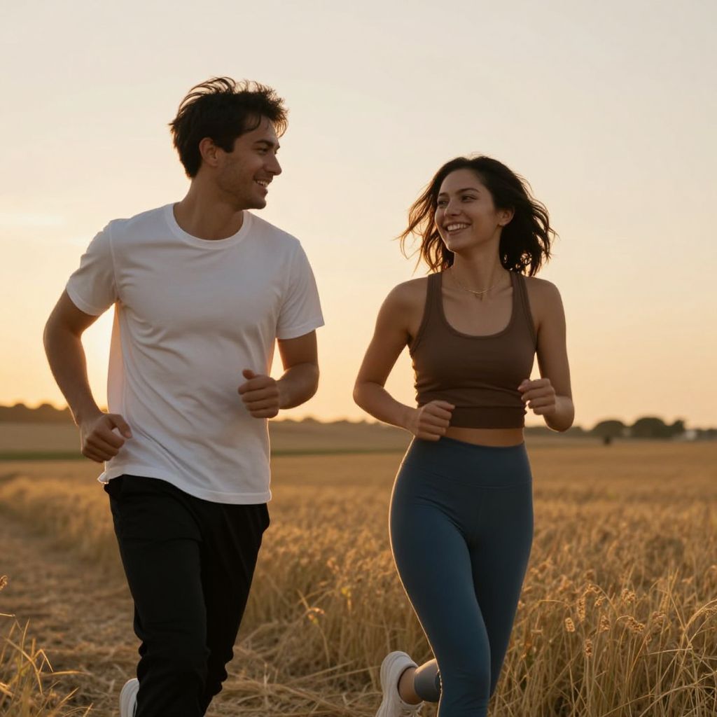 Two individuals, a man in a white T-shirt and black pants and a woman in a brown tank top and blue leggings, share a joyful moment as they run side by side through a golden field during sunset, their smiles radiating warmth and camaraderie.