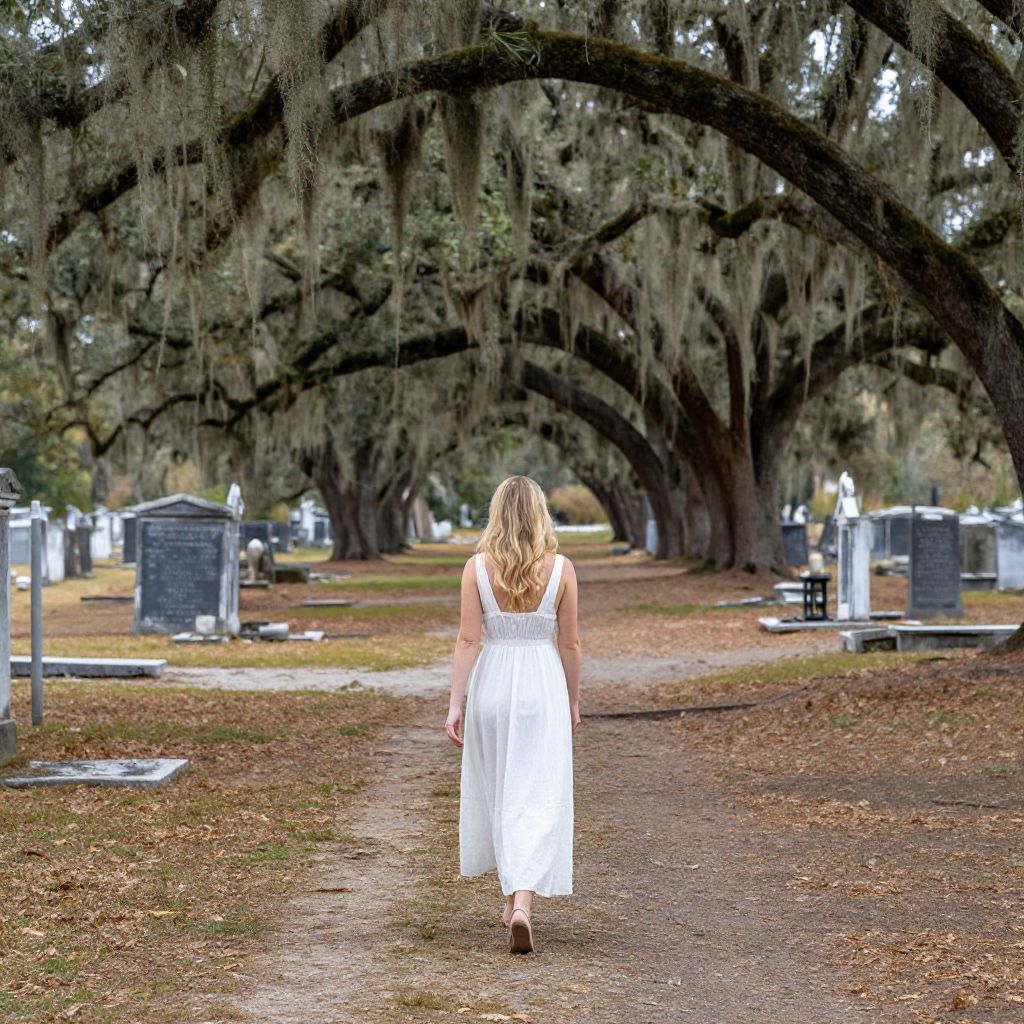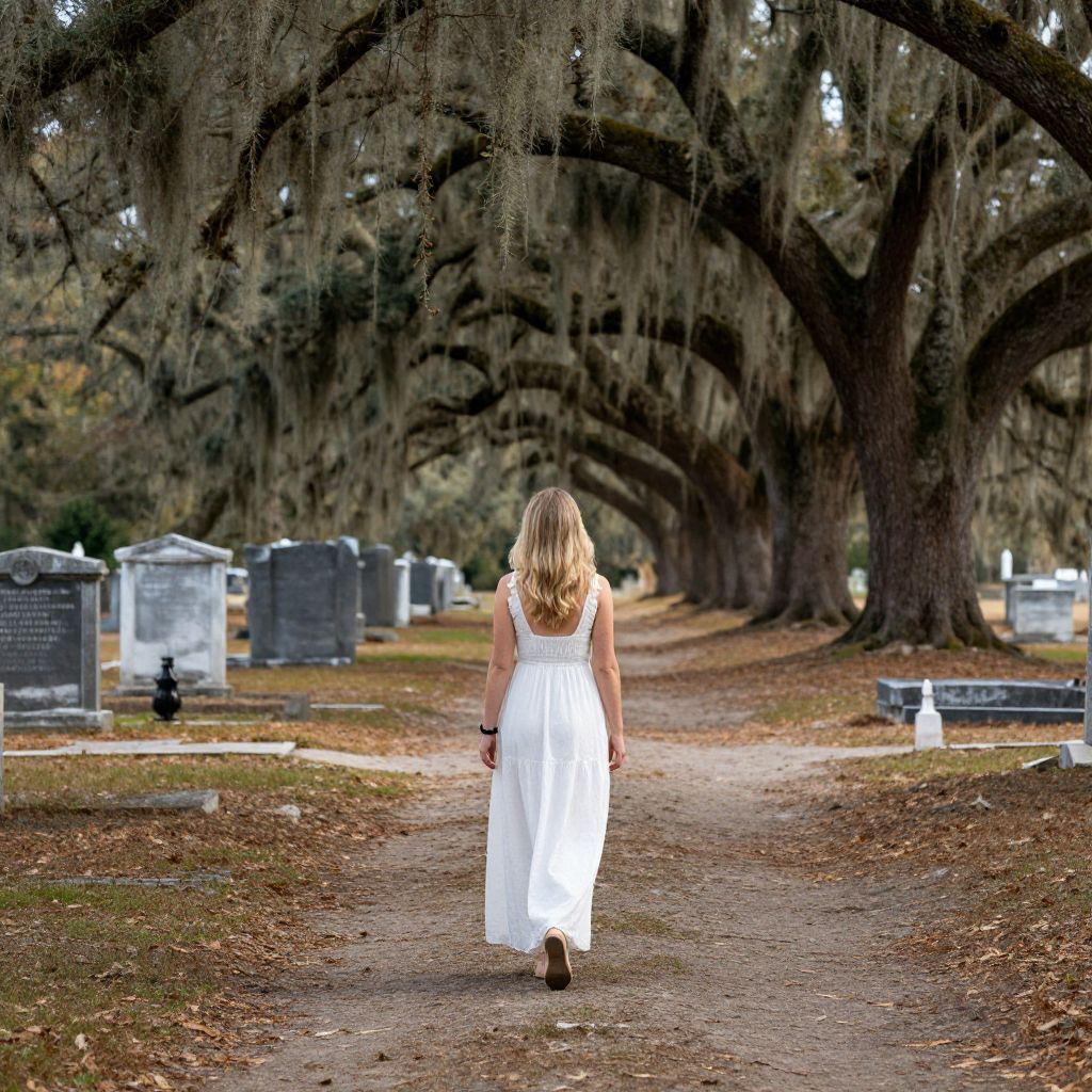 Photograph of a woman with long blonde hair, wearing a sleeveless white dress and black heels, walking away from the camera down a dirt path in a cemetery. The path is flanked by large, sprawling oak trees with hanging Spanish moss. Several gray and black tombstones are scattered throughout the background, with a few gravestones closer to the path. The ground is covered in brown fallen leaves, and the scene is bathed in soft, natural light. The overall atmosphere is serene and slightly melancholic.