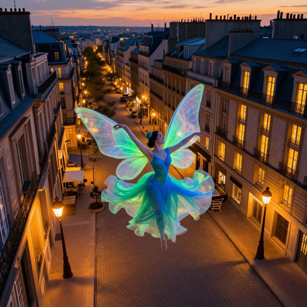 An enchanting dancer with gossamer wings reminiscent of Lautrec's famed Moulin Rouge performers elegantly soars above the vibrant Parisian streets at twilight. From an aerial perspective, behold her captivating dance as she twirls gracefully over cobblestone pathways and glowing windows, enveloped in the warm amber light of gas lamps that cast elongated shadows beneath her ethereal wings. The vivid palette of sapphire blues, emerald greens, and golden sunsets encapsulates the allure of Parisian nights, while evoking a sense of wonder at the harmonious blend of dance and flight, as her otherworldly presence illuminates the city's enduring beauty.