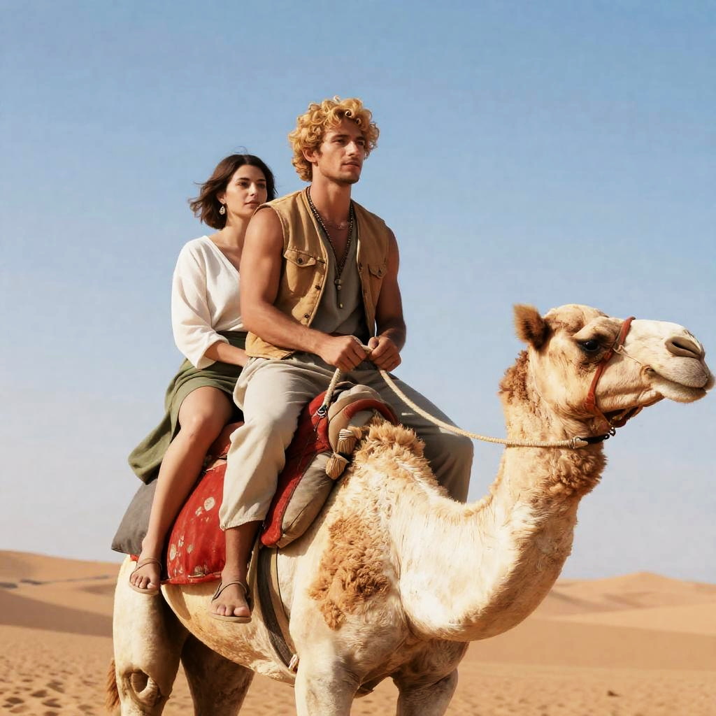 Photograph of two people riding a camel in a desert. The man with curly blonde hair, muscular build, and a tan vest sits in front, holding the reins. The woman with short brown hair, wearing a white top and green sash, sits behind him. The camel has a beige coat, red saddle, and gray saddlebags. Both look ahead with neutral expressions. Clear blue sky in the background.