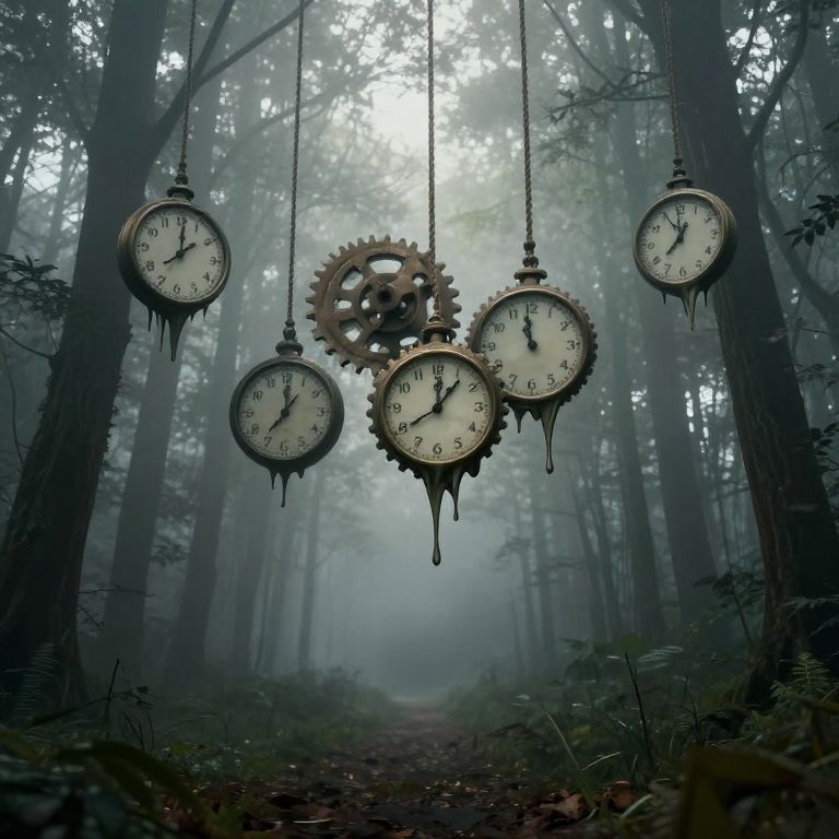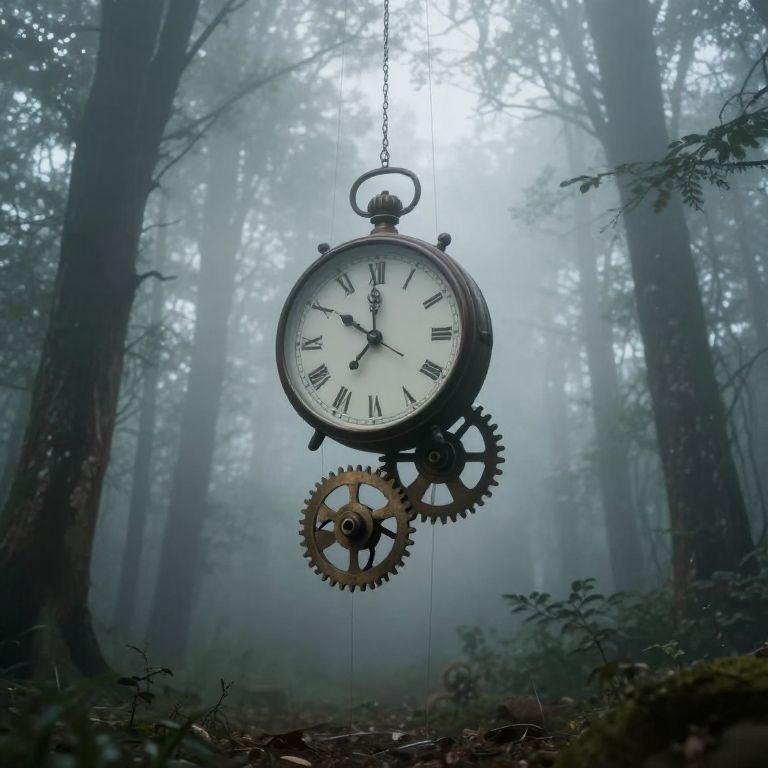 A colossal clock emerges from swirling fog, its luminous face casting an ethereal glow as a solitary figure stands before it, suspended between the tangible and the timeless.