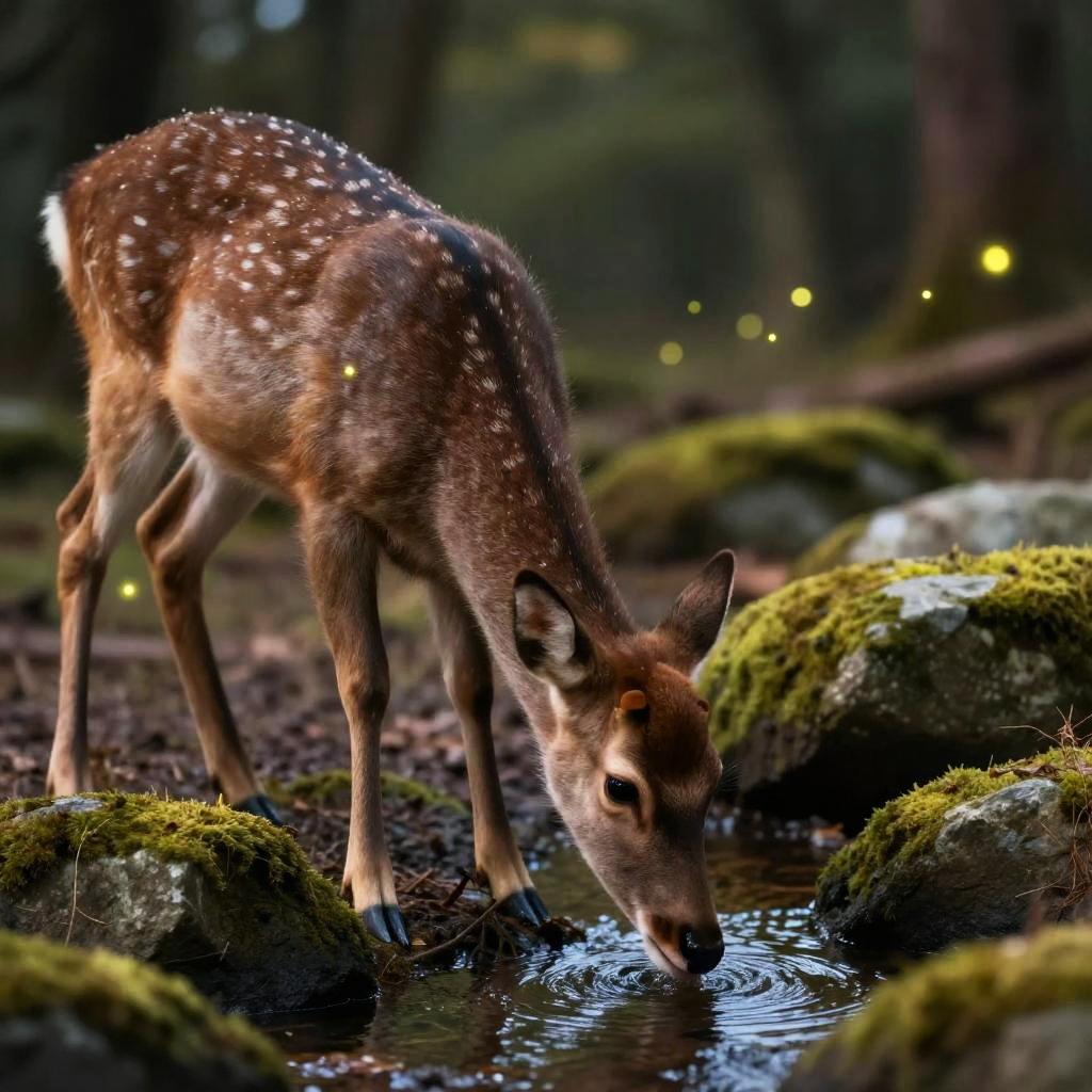 Highly detailed illustration of a gentle deer drinking from a stream, in a quiet forest clearing with moss-covered rocks, with soft twilight glow with fireflies hovering, soft textures, serene mood, intricate fur patterns, HD quality, gentle shadows, creating an inviting atmosphere for relaxation