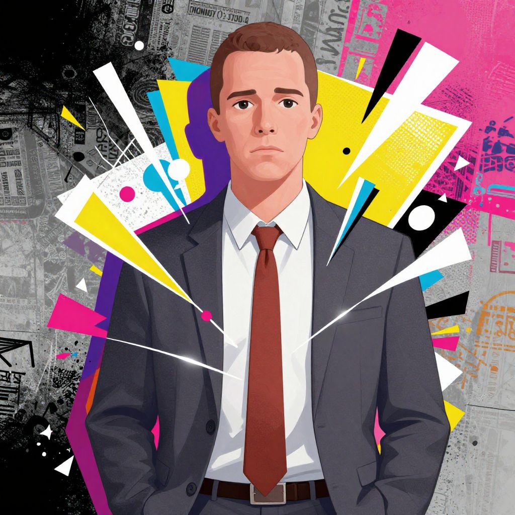 Jesse Pinkman character analysis, stylized illustration focusing on emotional depth, fragmented composition with sharp angles and bold colors representing chaos and hope, street art influence with layered graffiti textures, dynamic and raw atmosphere.