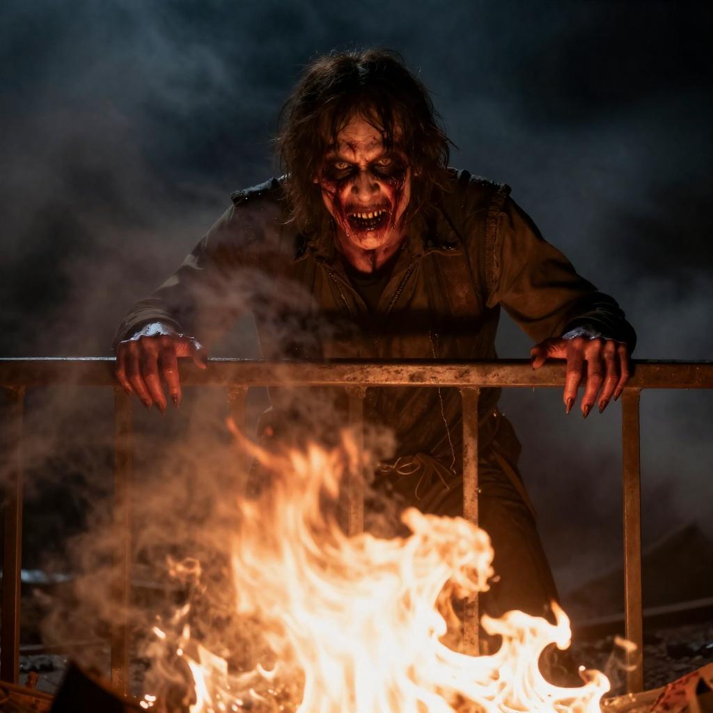 A burned man with clawed hands and a grotesque face leans over a metal railing. Bright flames fill the foreground. Dark, smoky background. Horror film scene. One person, intense expression.