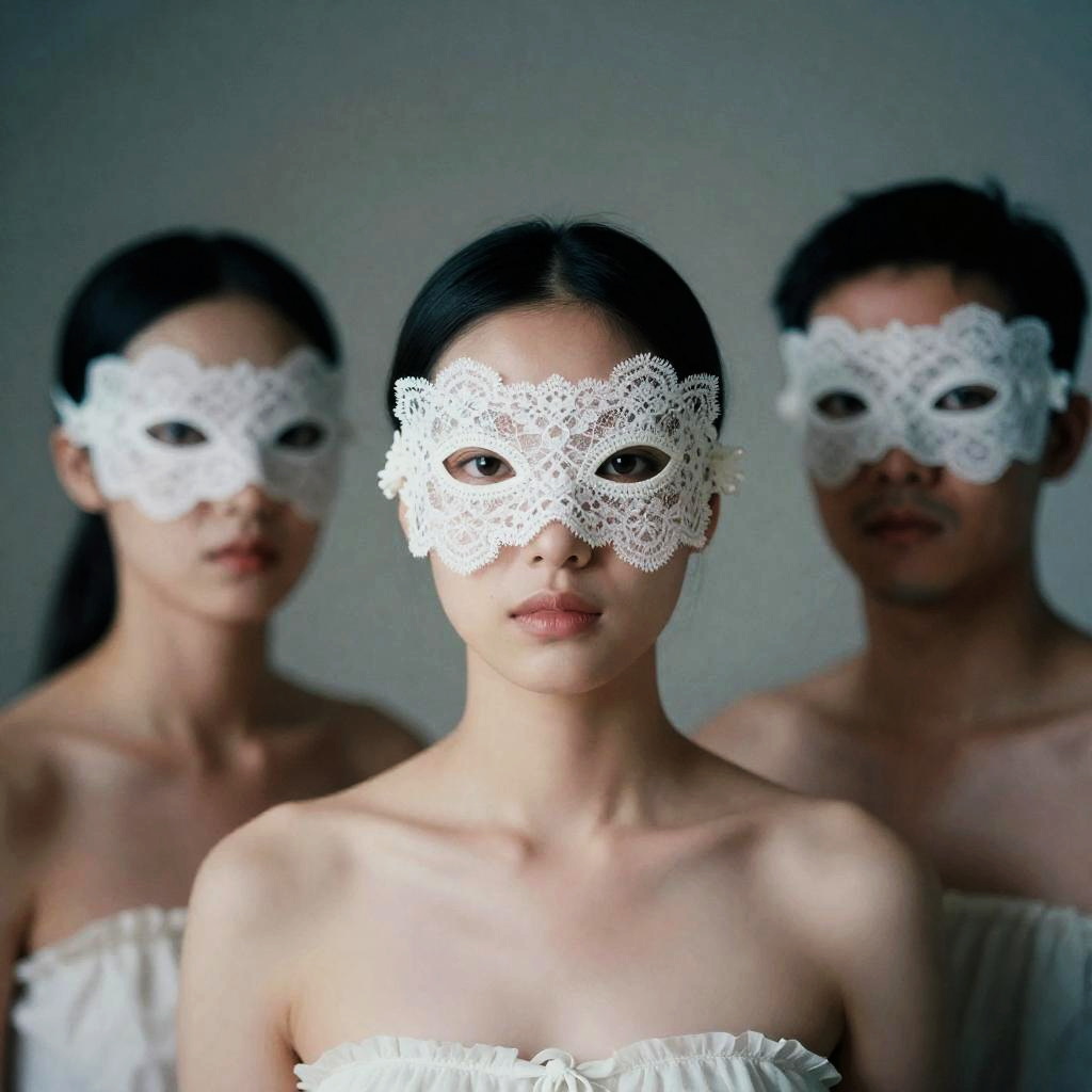 Photograph of three Asian individuals with pale skin, wearing white lace masquerade masks that cover the upper half of their faces. The central figure, a slender woman with straight black hair, gazes directly at the camera, her bare shoulders exposed. She wears a strapless white top. Flanking her are two slightly blurred figures, one male and one female, both also wearing white masks and similar tops. The background is a soft, neutral gray, emphasizing the subjects. The image has a dramatic, slightly ethereal quality, with focused lighting on the central figure.