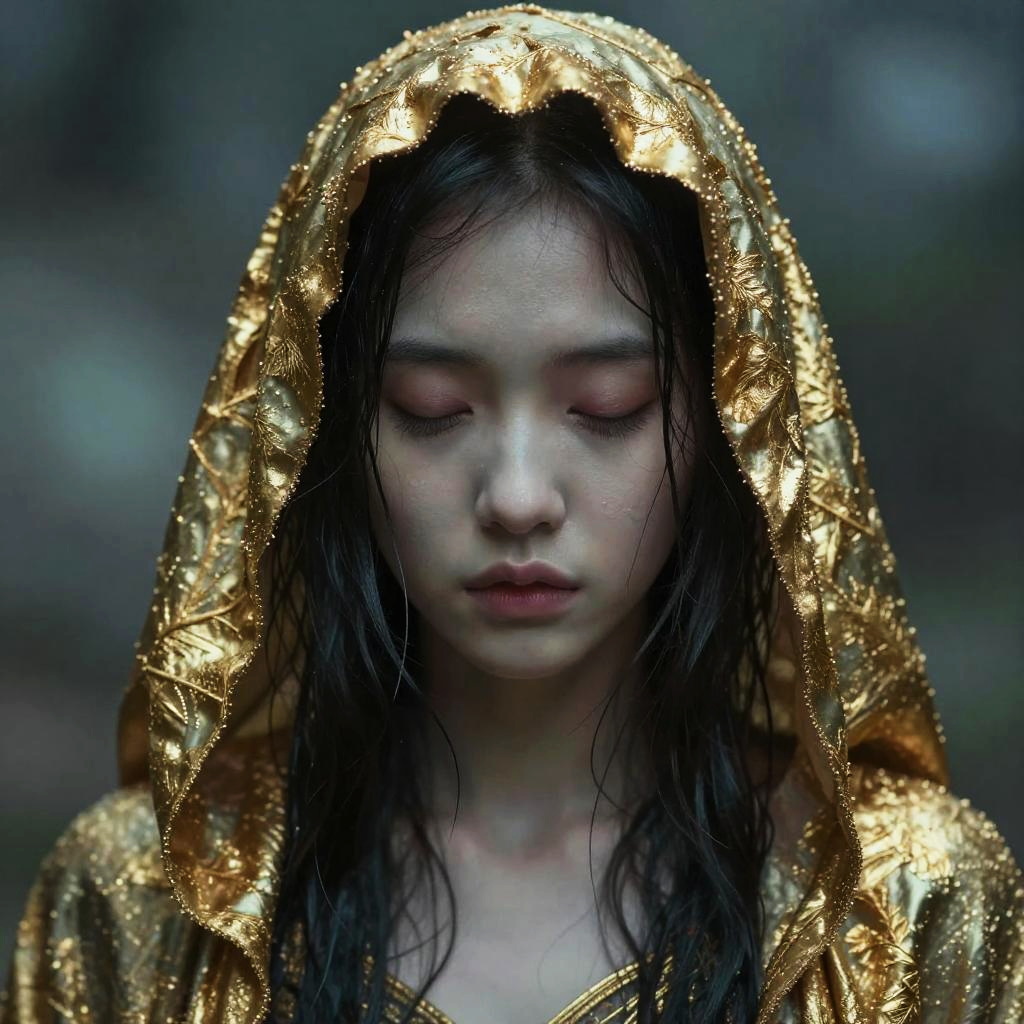 Realistic photo.Surreal fashion portrait of an enigmatic avant-garde performer, styled with lace masks, shot by Tim Walker and David Bailey, ethereal atmosphere, dreamy aesthetics, film grain, analog photograph, shot on Fuji camera. realistic photo