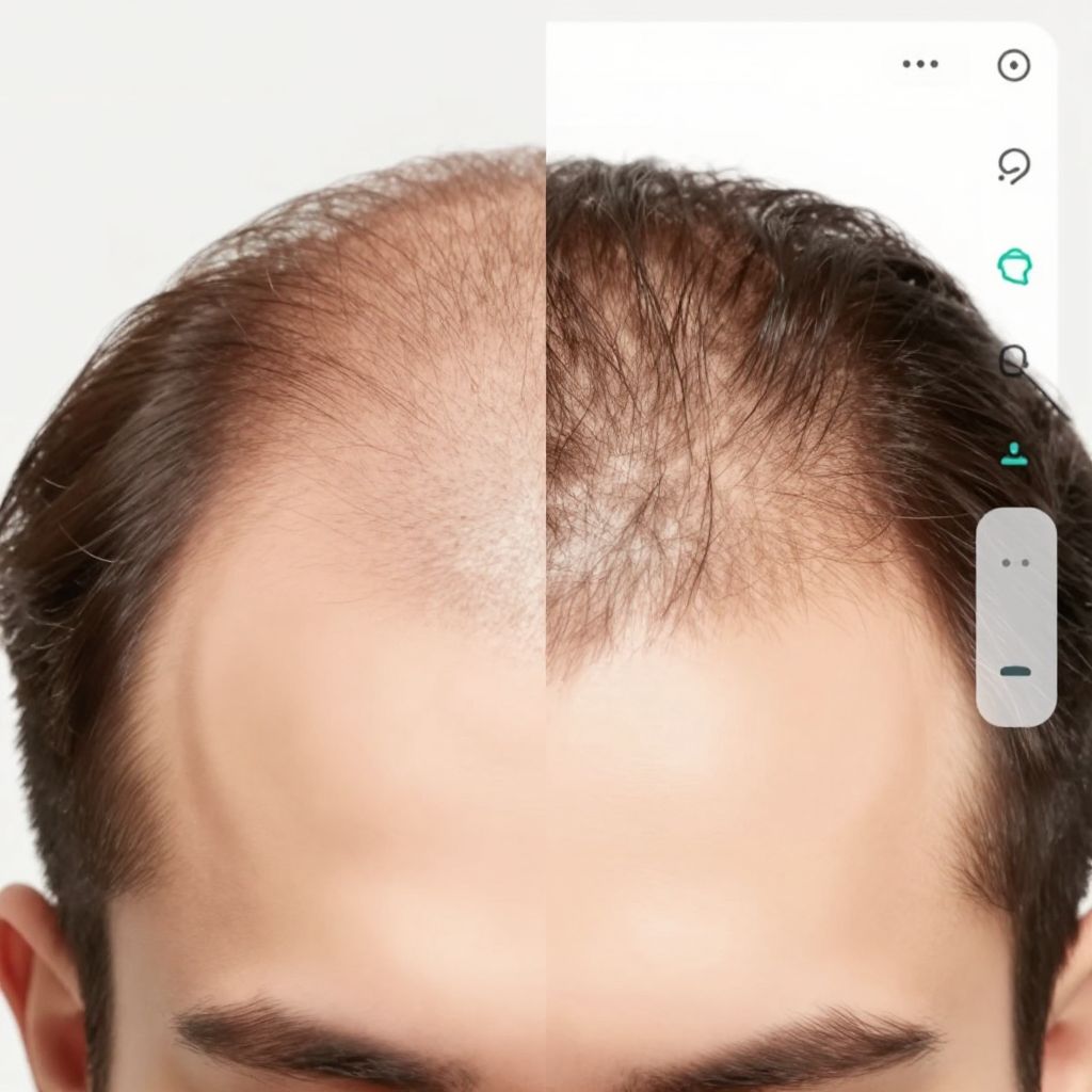 Make me bald online free, close-up of a person before and after virtually removing hair, split screen style, realistic photo manipulation, soft shadows, focus on scalp smoothness, digital UI icons for editing, fresh and engaging online tool atmosphere.