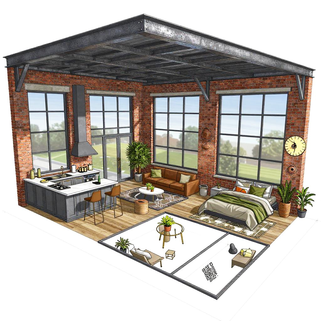 Free floorplan of a spacious loft with industrial design elements, exposed brick walls, metal beams, and large glass windows, featuring an open kitchen, living area, and a cozy bedroom, illustrated in a vibrant detailed 2D architectural blueprint style.