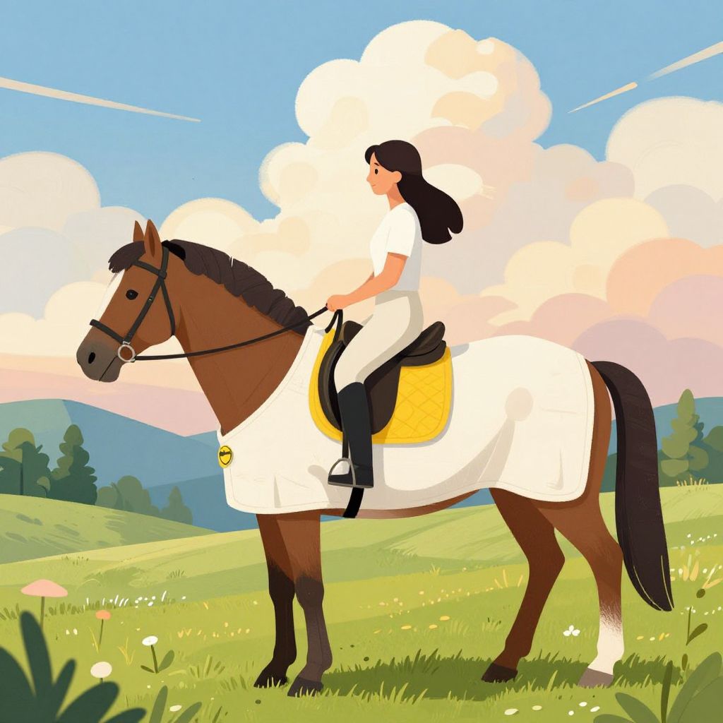 A vibrant digital illustration depicts a serene scene of a woman riding a therapy horse adorned with a white blanket and yellow saddle pad, set against a lush, pastoral landscape with soft, impressionistic clouds and golden-hour lighting.