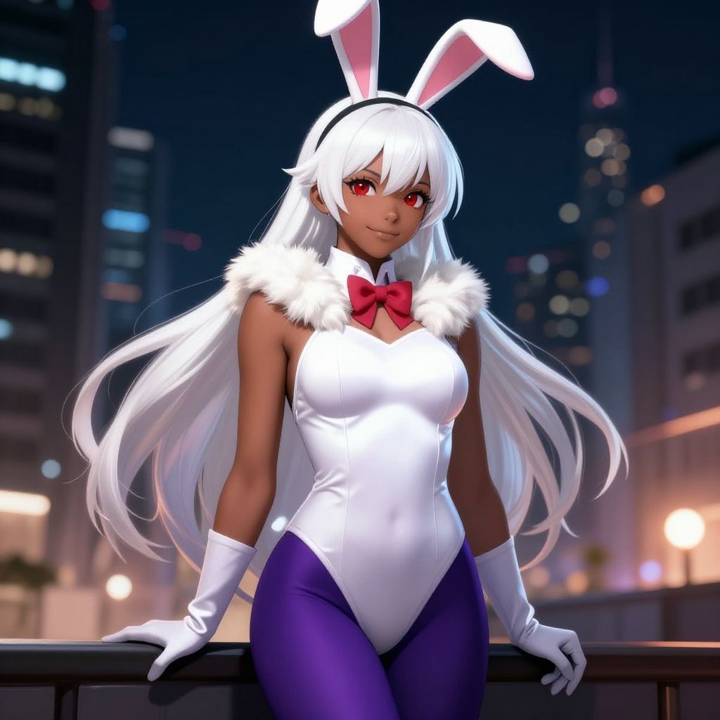 Digital anime-style drawing of a dark-skinned woman with white hair, bunny ears, and a revealing white fur-trimmed bunny suit in a neon
